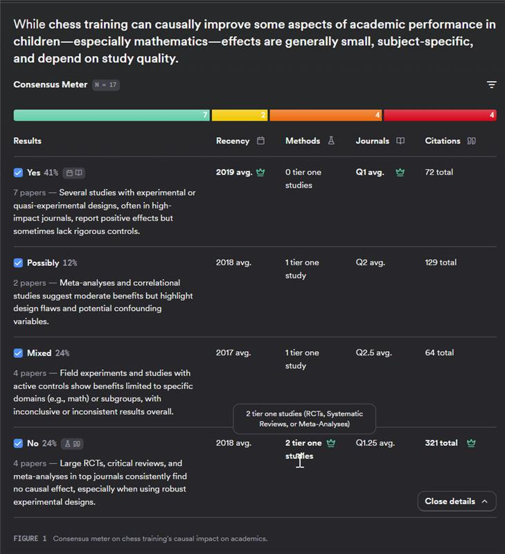 The recent addition of Consensus Deep Search mode is a great boost to its retrieval capabilities. On top of that, it has one of the most appealing interfaces out there, with color-coded references, and the Consensus Meter, for all its methodological faults, is likely to appeal to undergraduates and less advanced users.